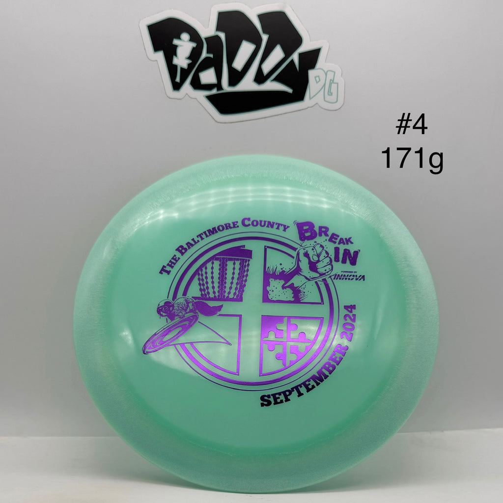This disc features The 2024 Bob Bell Baltimore County Break In: Powered by Innova event stamp. The Break In was a C-Tier PDGA-sanctioned singles tournament that was held on Saturday, September 14, 2024 at County Home Park in Cockeysville, Maryland. This was the first ever tournament to be held at the newly constructed County Home Park Disc Golf course.