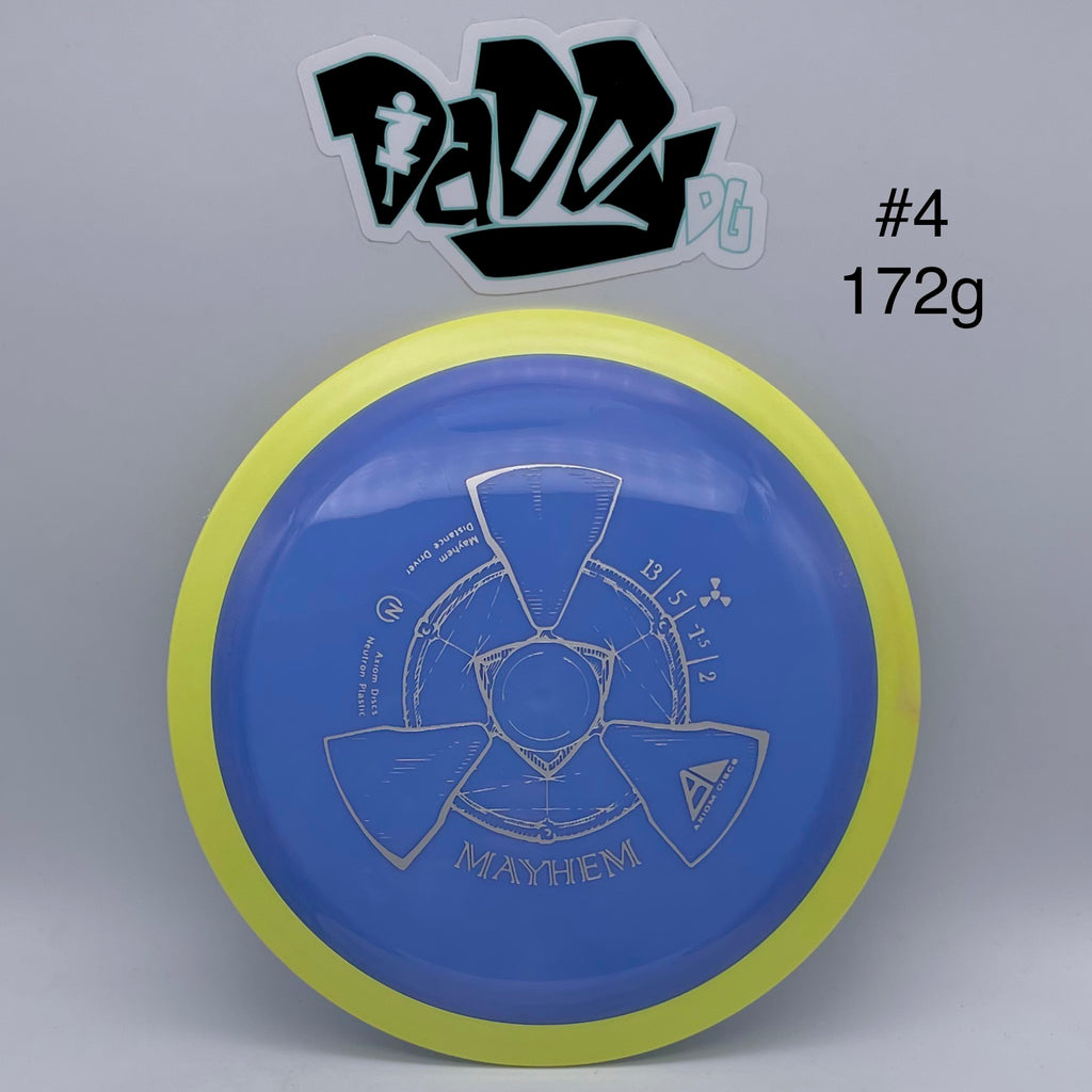 Mayhem is the debut model from Axiom's new 23mm high speed distance driver class. With a responsive straight-stable profile and plenty of speed, Mayhem should be a workhorse driver for many advanced and expert GYROnauts. Like the MVP 23mm class, the Mayhem has a pronounced dome to promote distance-covering glide. Expert throwers will find the Mayhem ready to stand up and boom or drift over from flat, while average power throwers will be able to mash on it without fear of unmanageable turn. Mayhem is best compared to a beat MVP Octane.