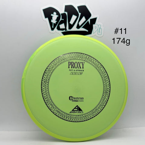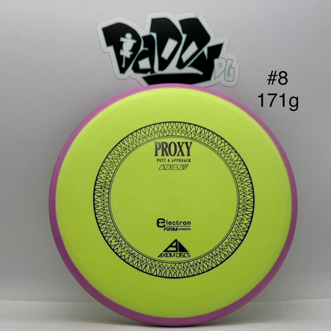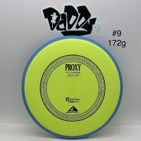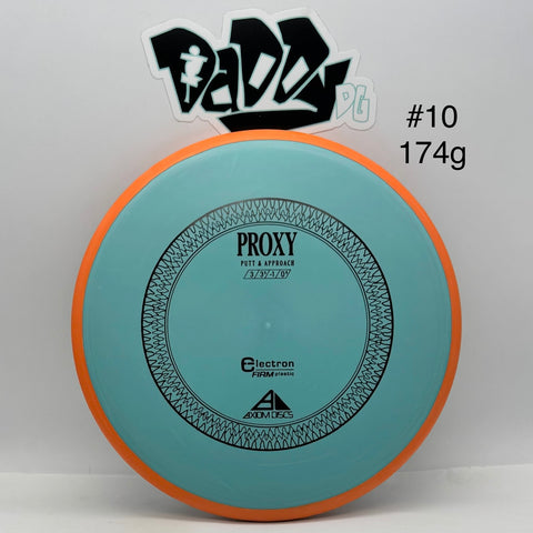 The Proxy shares the Envy mold's core, lending the same low-profile feel and solid grip, along with a short wing width and wide flight plate diameter for superior glide. The Proxy sets itself apart from the Envy with a remarkably straight forward-fading finish. A bit of high-speed turn potential allows the Proxy's lines to be manipulated over a broad range of power, and helps less powerful throwers achieve straight putter drives.