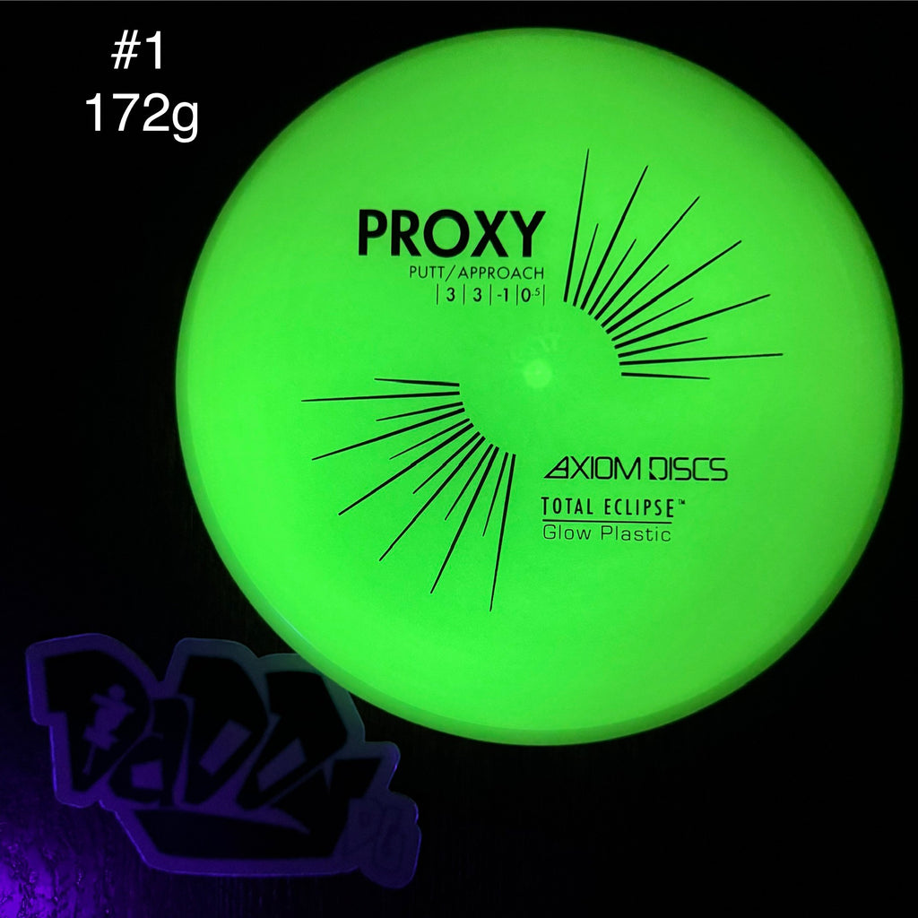 Sharing a core with the Axiom Envy, the Proxy maintains the low-profile feel and solid grip of the Envy, but with a more neutral flight path out of the box. High-speed turn and a forward fading finish set the Proxy up to be an incredibly versatile disc for shot shaping through wooded holes, around corners, or just laser straight shots. Now available any time of the year in the color glow cores and rims of Total Eclipse plastic - Green, Blue, Purple, Teal, and White - you can reliably add the Proxy to your bag for day or night. Experience one of the most versatile putters in the MVP family by grabbing your own Total Eclipse Proxy!